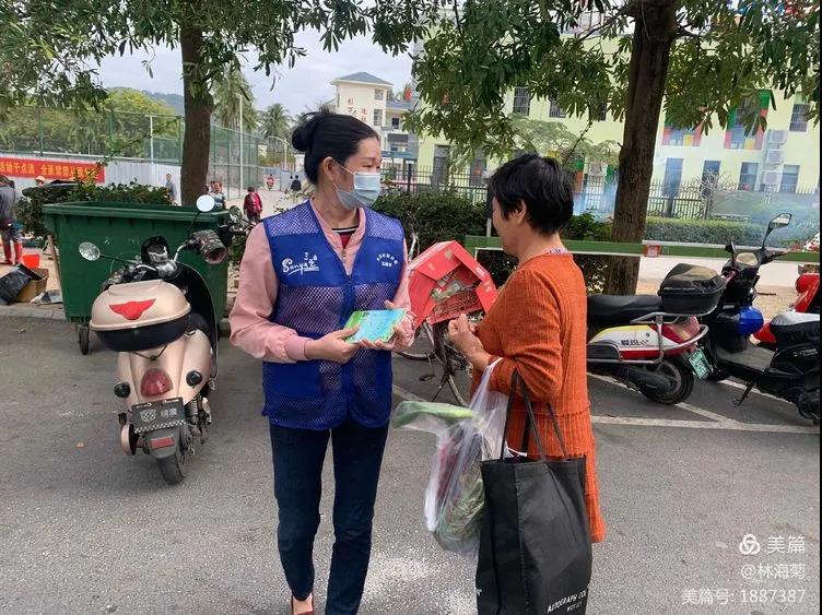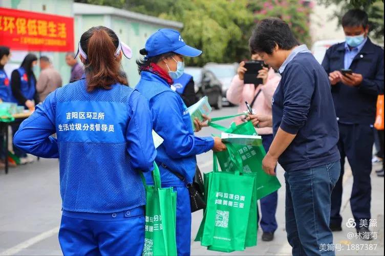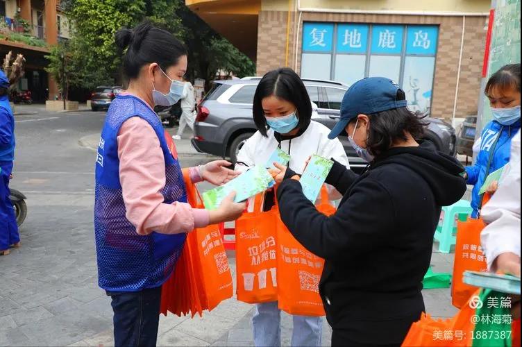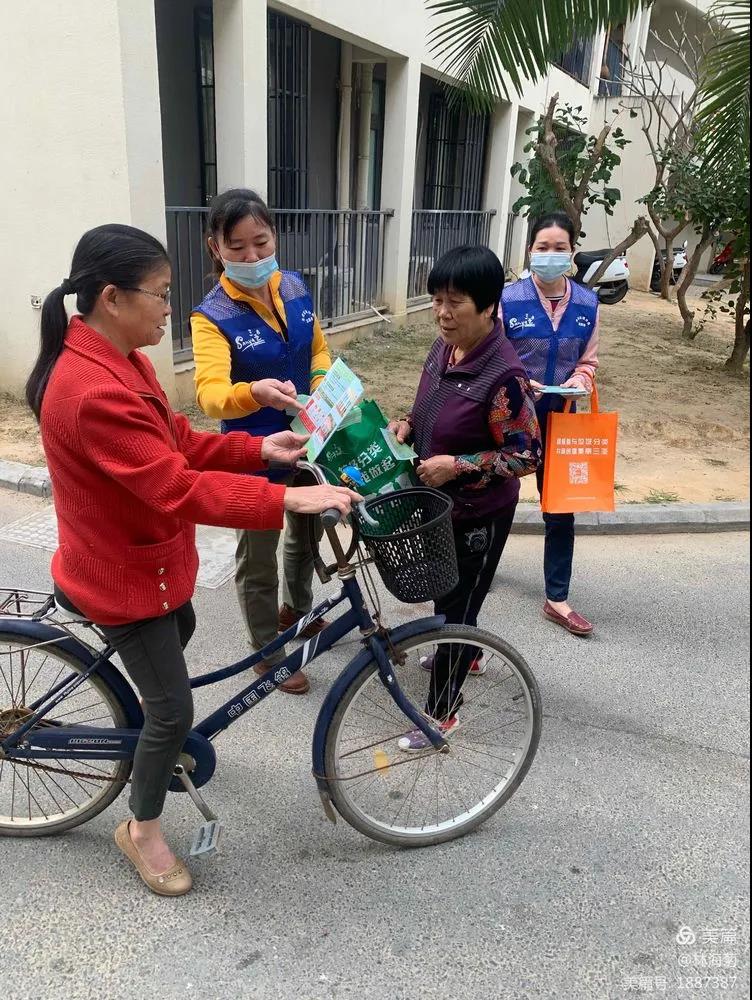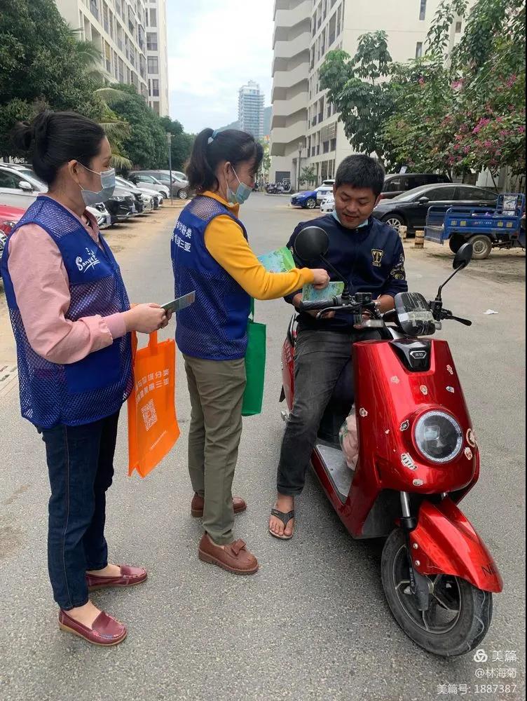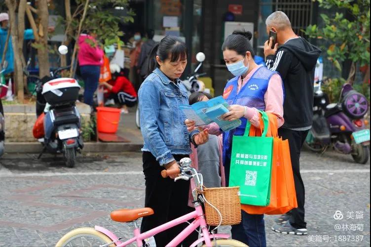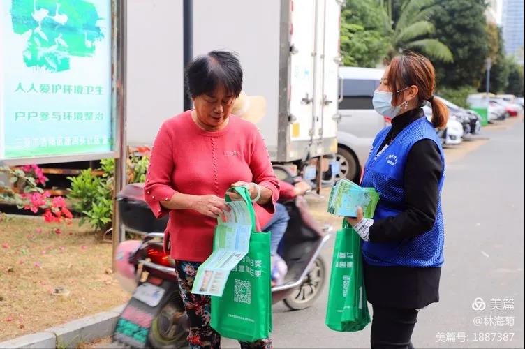 吉陽(yáng)環(huán)衛(wèi)垃圾分類(lèi)督導(dǎo)員與社區(qū)工作人員對(duì)居民分發(fā)垃圾分類(lèi)手冊(cè)