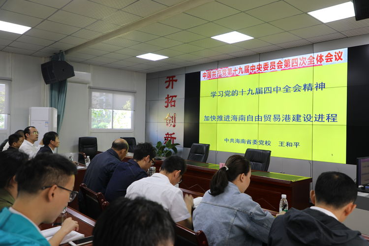 12月7日上午10:00時,一場主題為“學(xué)習(xí)貫徹黨的十九屆四中全會精神,推進(jìn)海南自貿(mào)區(qū)(港)治理現(xiàn)代化”專題輔導(dǎo),在明佳集團(tuán)辦公大樓三樓多功能會議廳舉辦。此次專題輔導(dǎo)報告是明佳集團(tuán)黨支部為了落實上級指示,學(xué)習(xí)宣傳貫徹黨的十九屆四中全會精神,以及省委書記劉賜貴宣講黨的十九屆四中會全精神時提出的要求,組織黨員干部集中學(xué)習(xí),確保將黨的十九屆四中全會精神傳達(dá)至每一名黨員及一線員工。